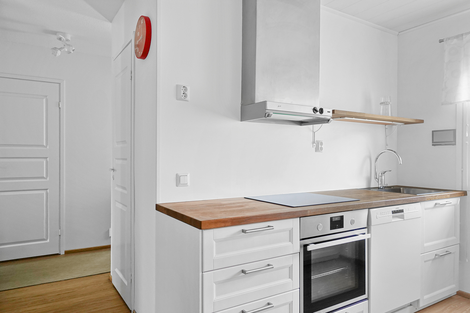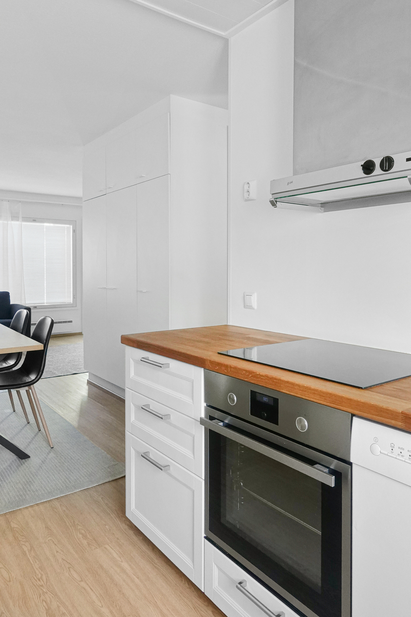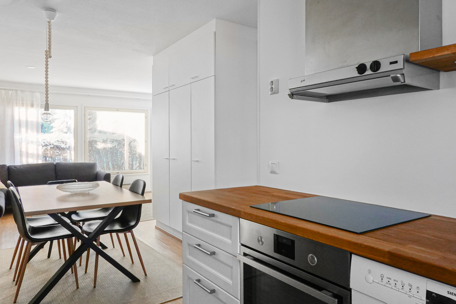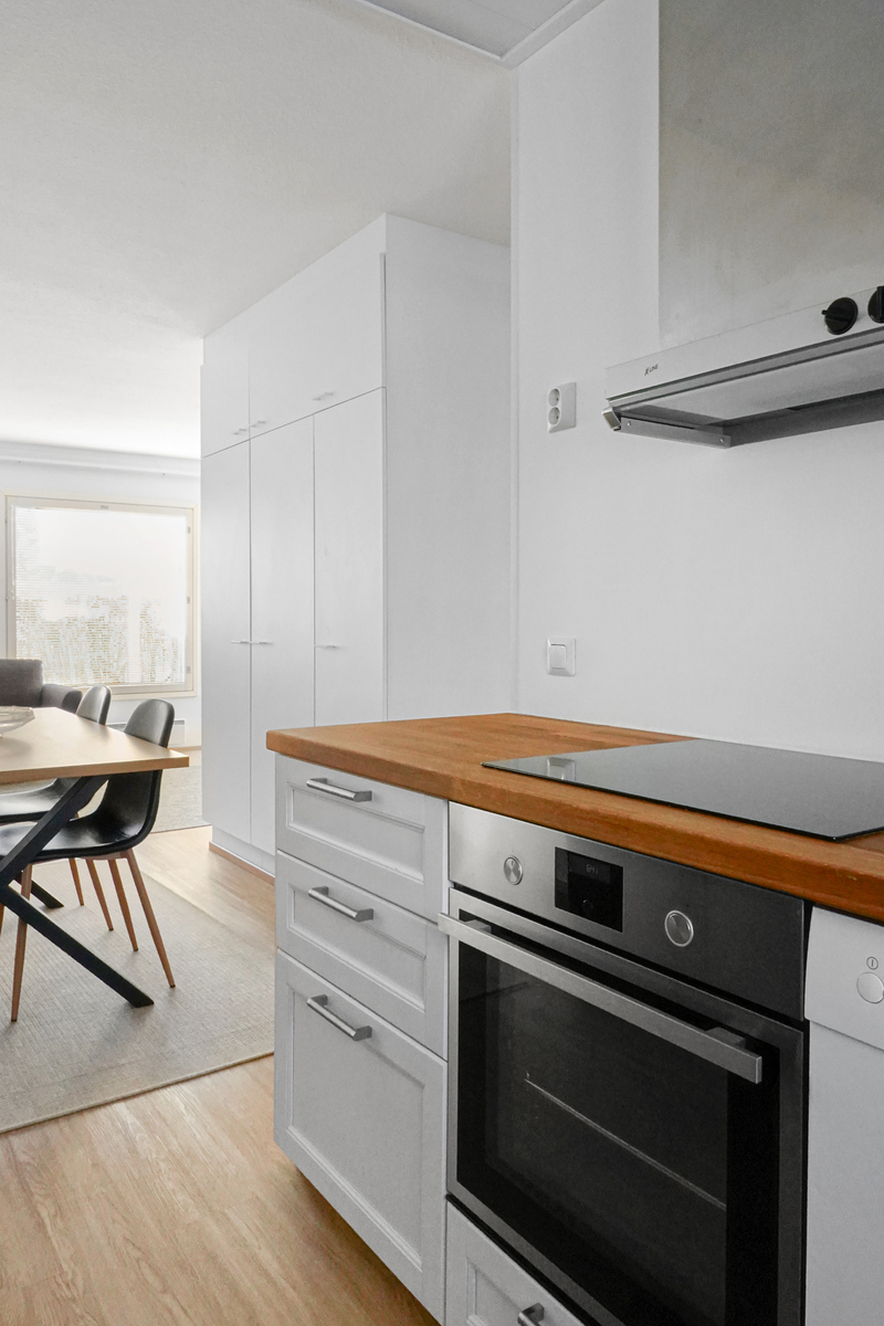 Jääkaappi/pakastin (2022), induktioliesi (2015), liesituuletin (2015), astianpesukone, työtasot tammea. Keittiökaapistot uusittu (2015). vinyylilankkulattia (2023), maalipintaiset seinät (2023) |