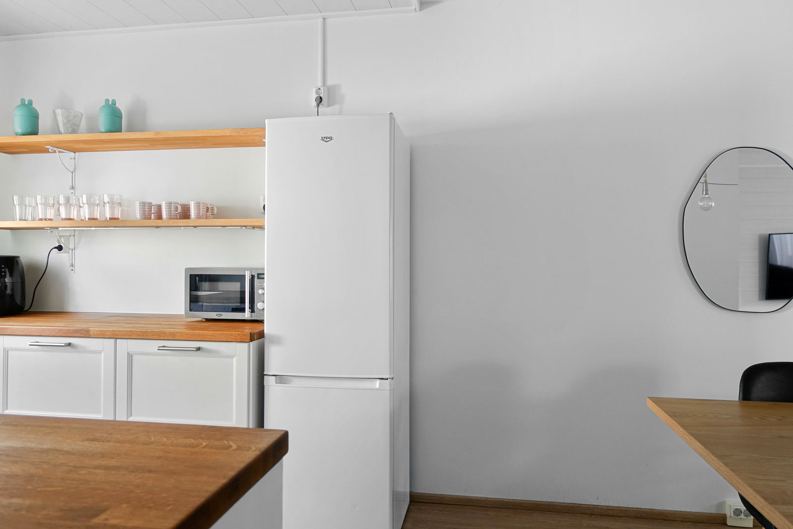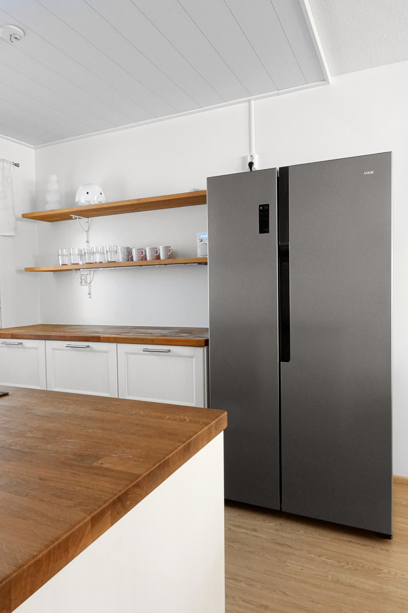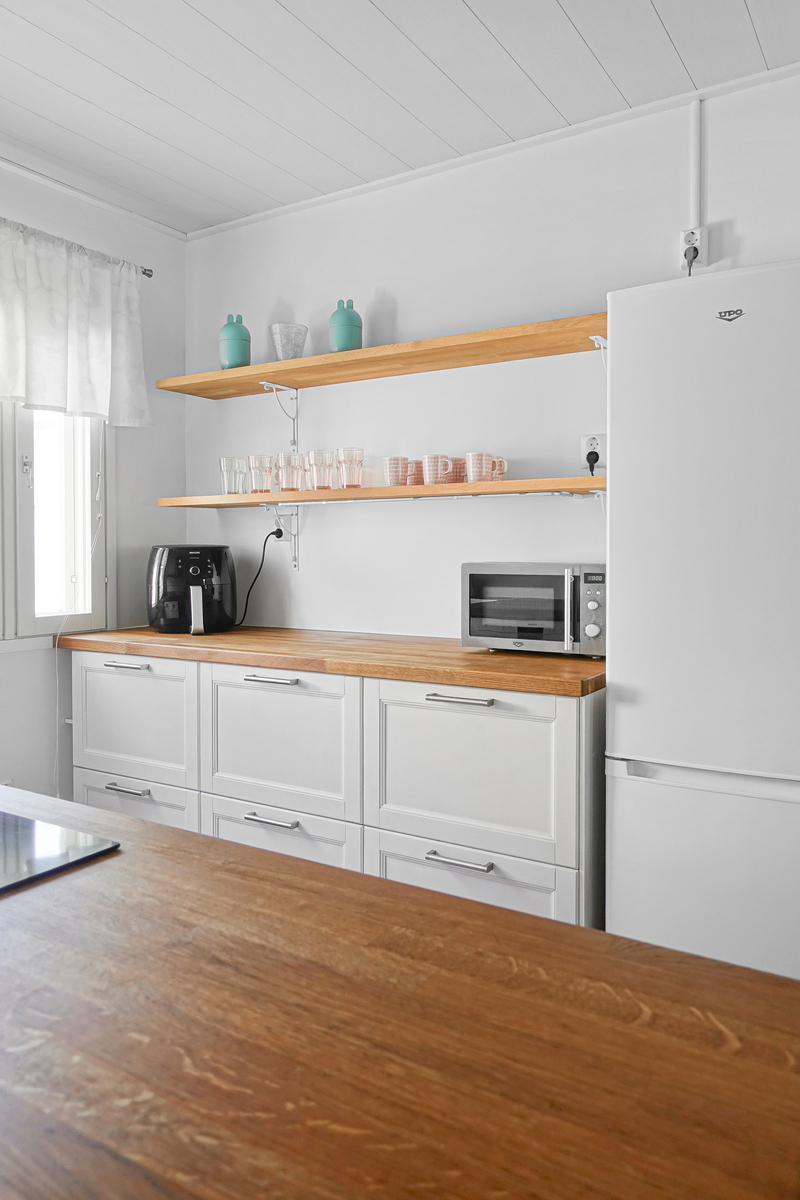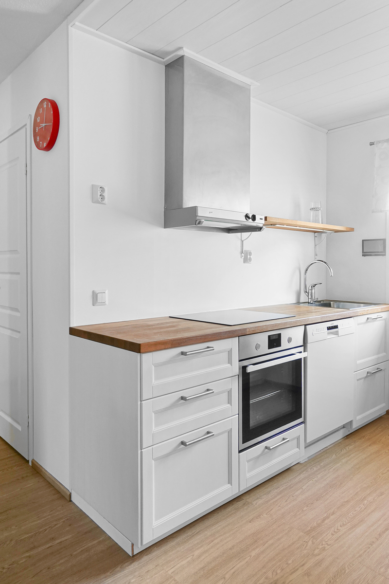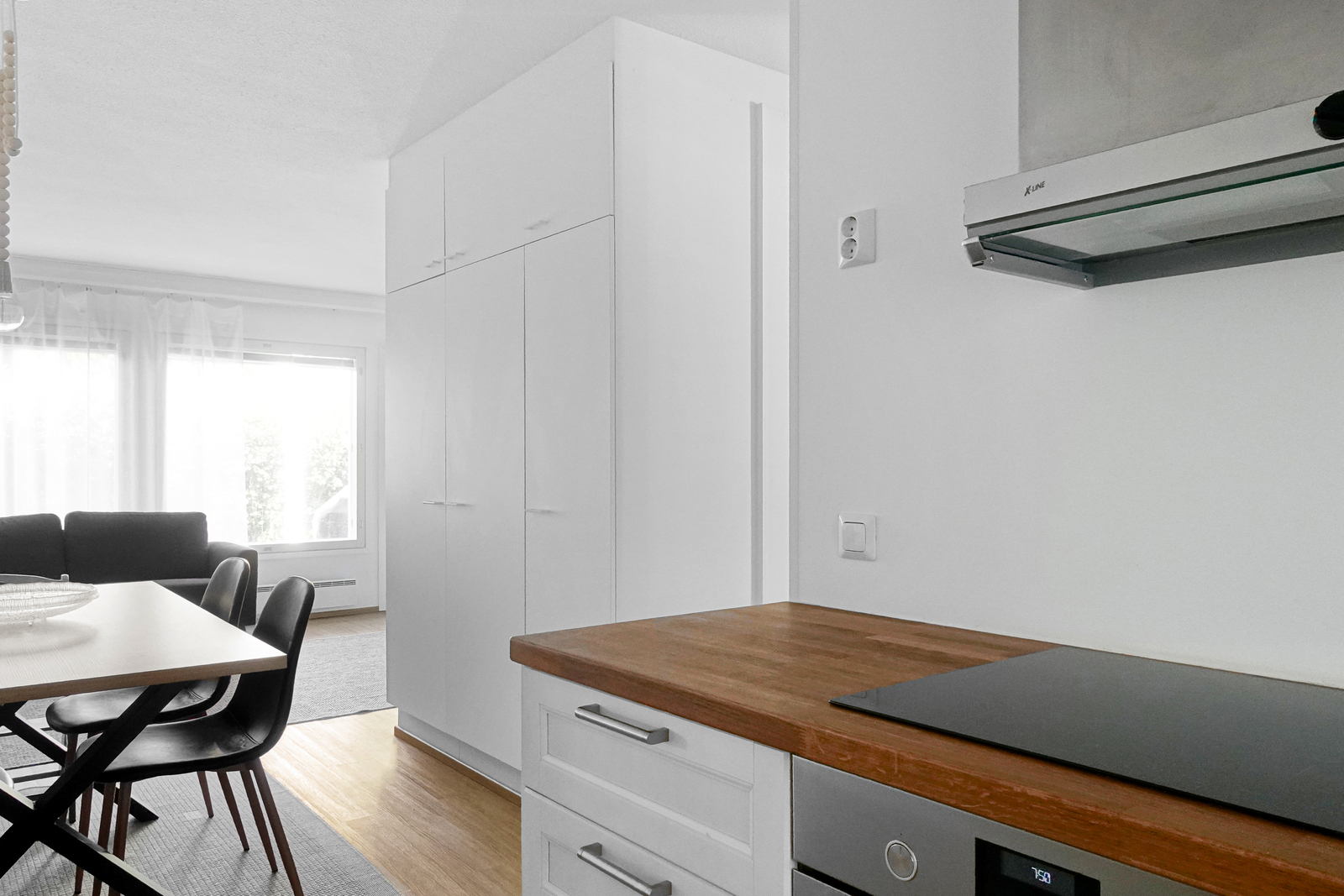Jääkaappi/pakastin (2022), induktioliesi (2015), liesituuletin (2015), astianpesukone, työtasot tammea. Keittiökaapistot uusittu (2015). vinyylilankkulattia (2023), maalipintaiset seinät (2023) |