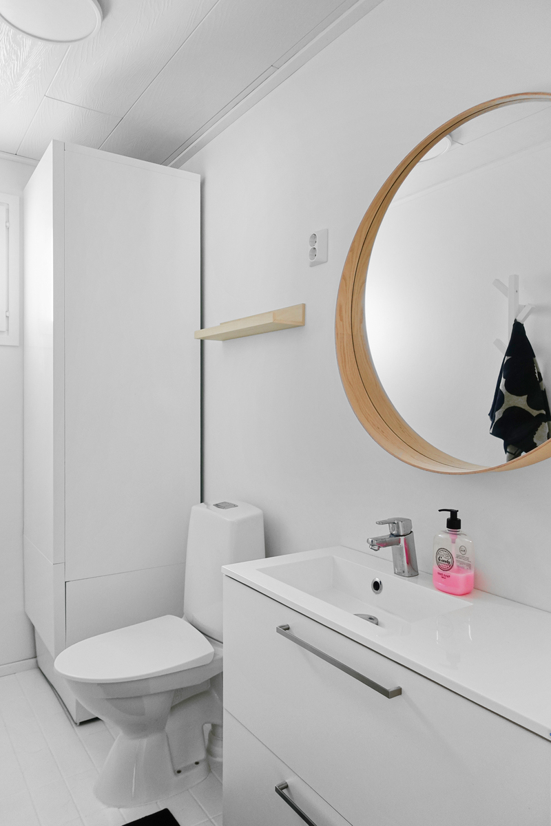Erillinen wc, laattalattia, allaskaappi, peili, lämminvesivaraaja. |