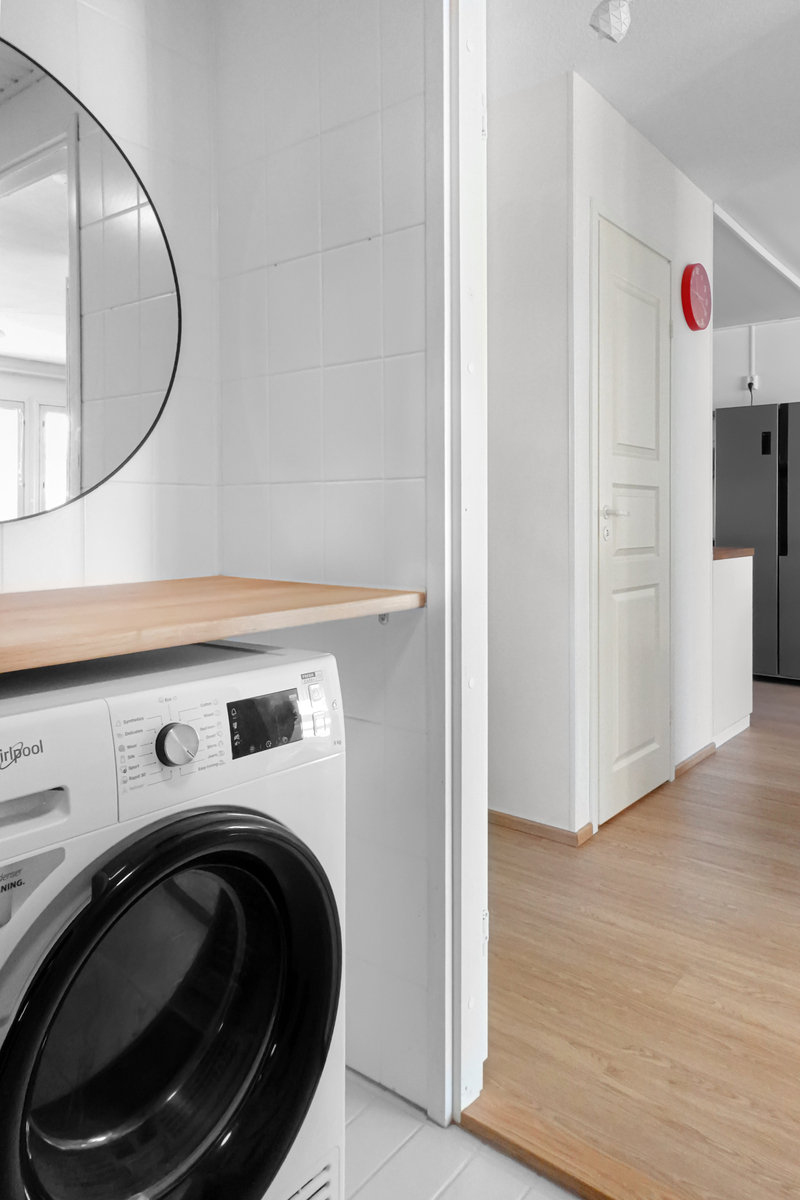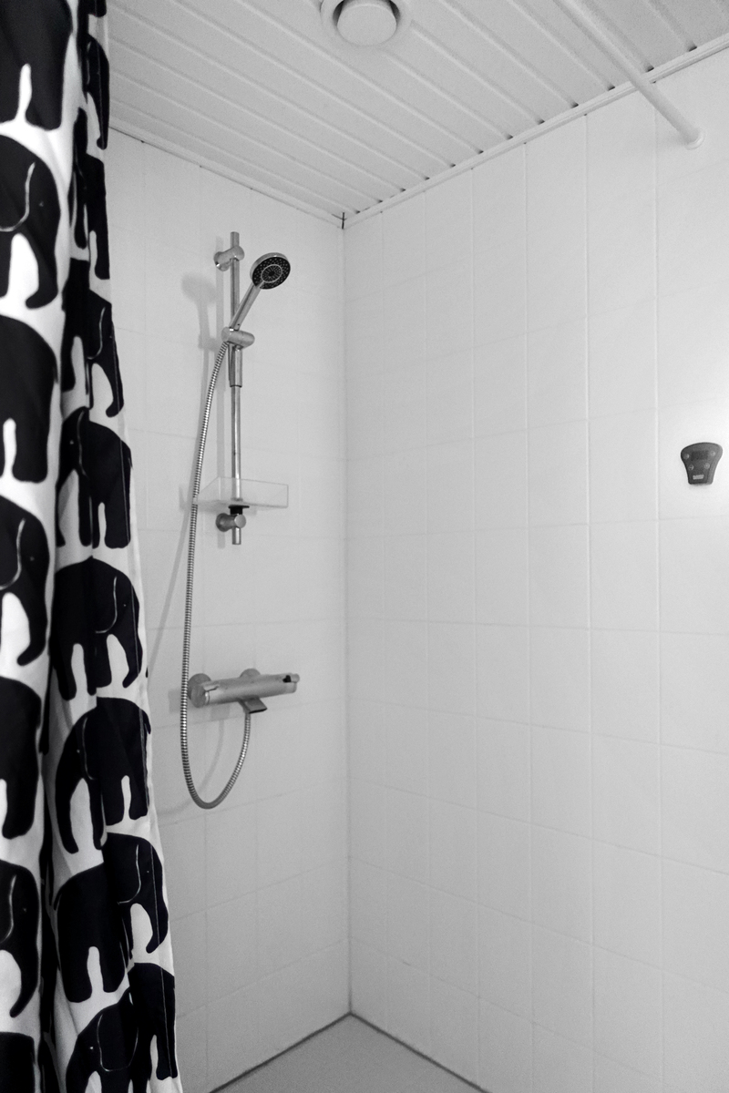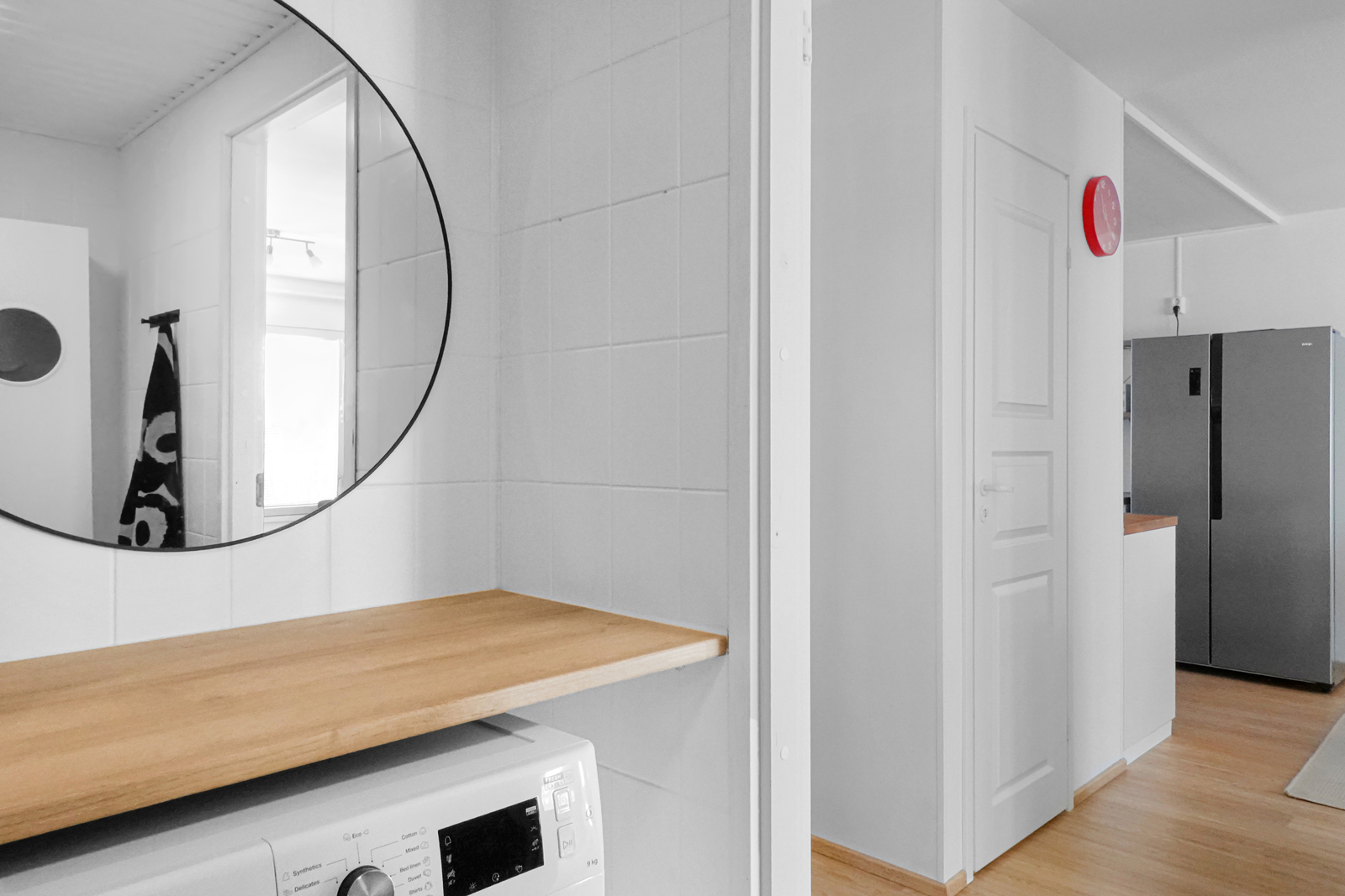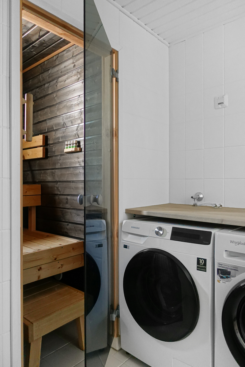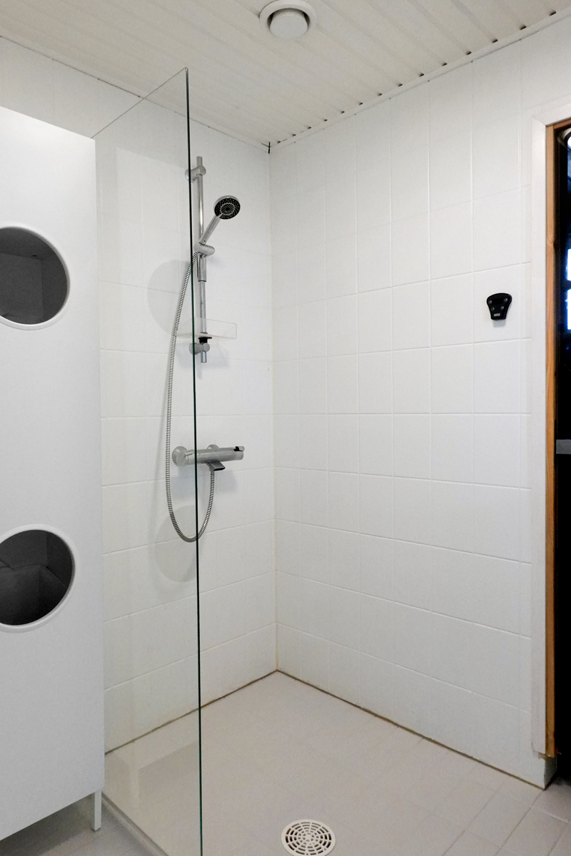 Suihku, pyykkikaappi, pesukoneliitäntä, lattialämmitys, lattia ja seinät laatoitettu. Kaakelimaalaus ja silikoonit uusittu v. 2023. |