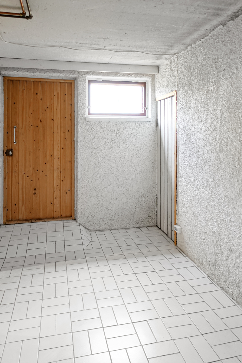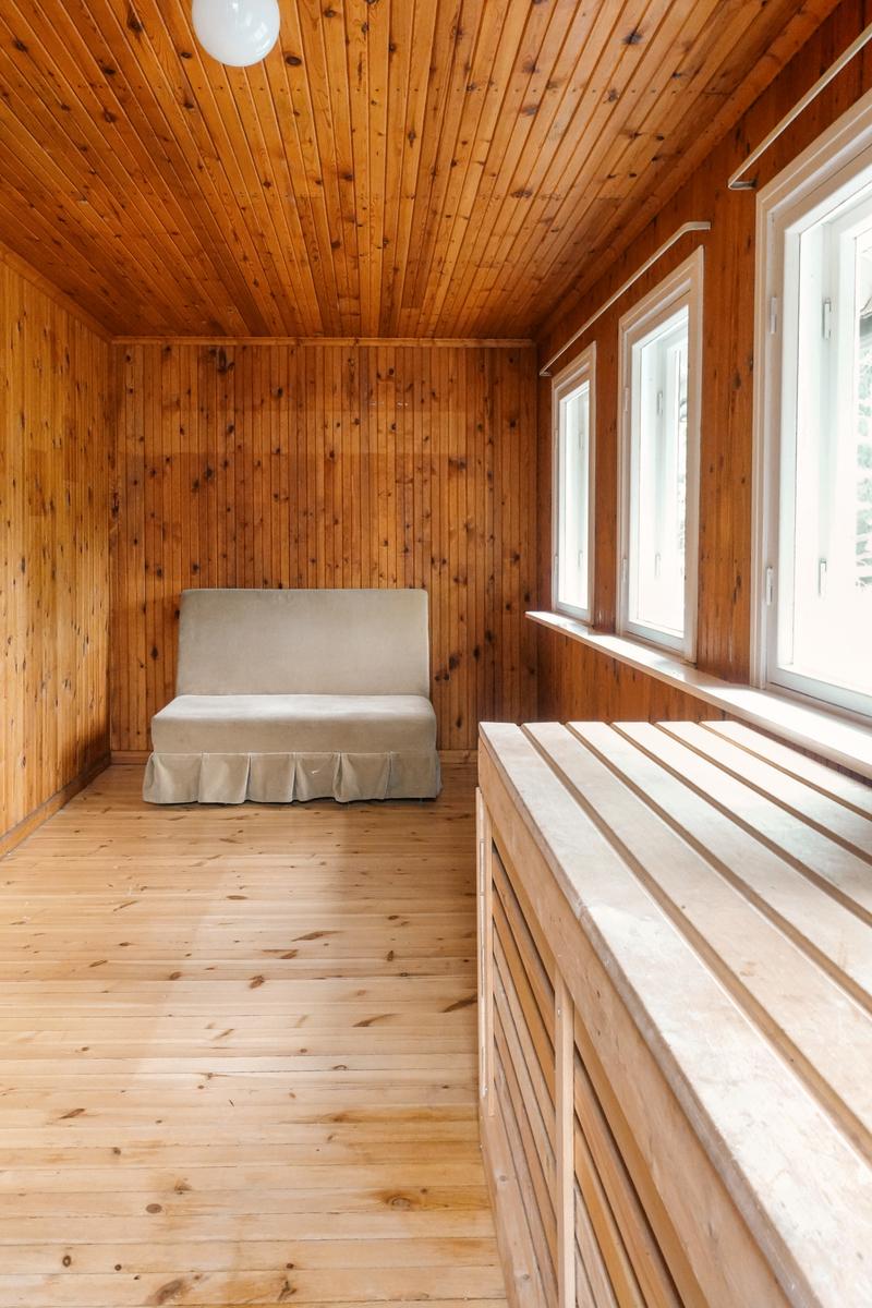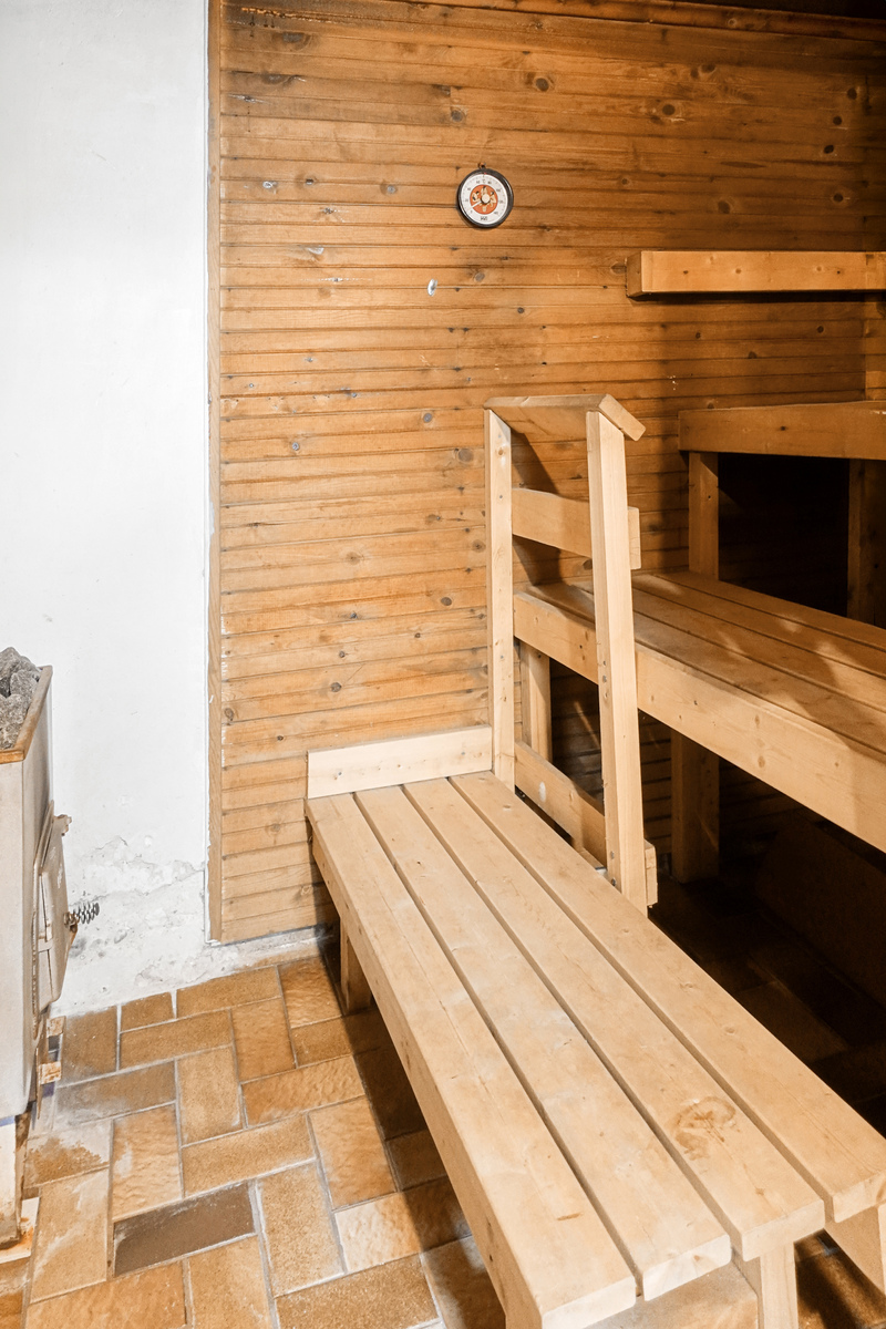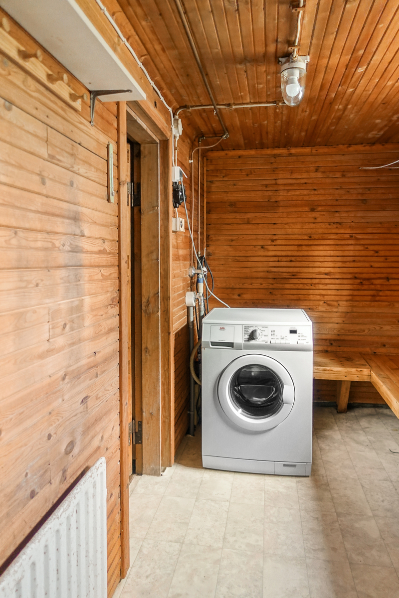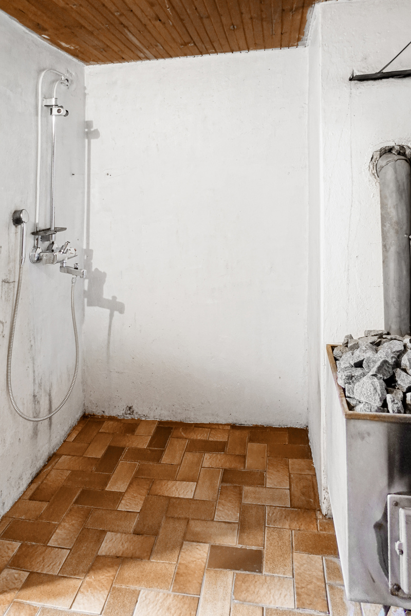 Sauna | Lattia laatoitettu, seinät puupaneelia/rappaus, katto puupaneelia. Saunan yhteydessä pesuhuone. Lattia laatoitettu, seinät betonia, katto puupaneelia, suihku. |
