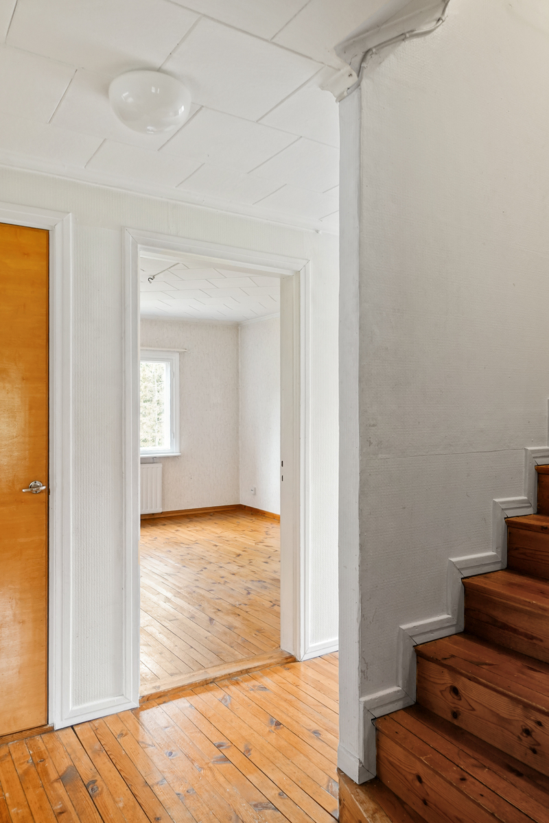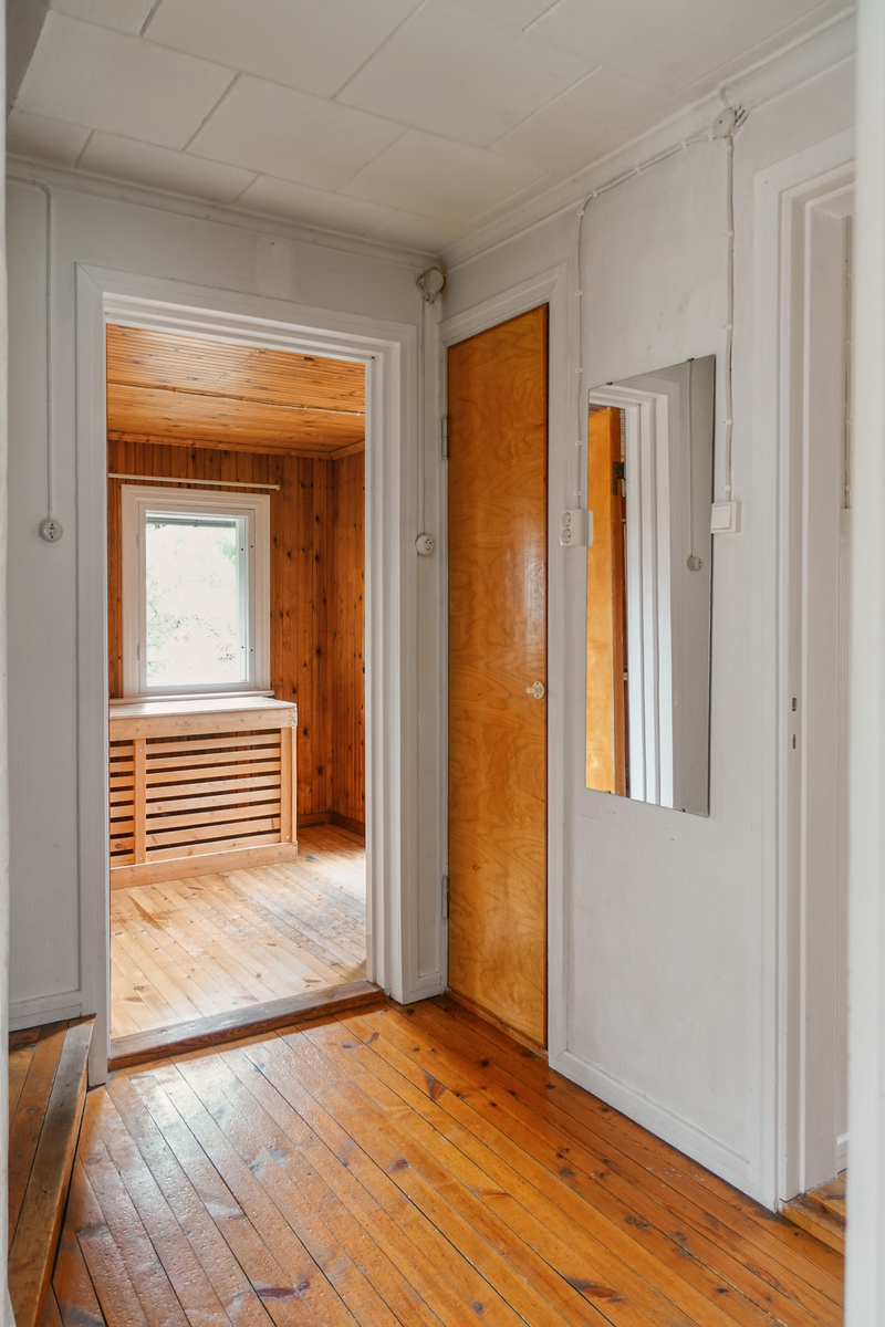 Lisätietoja | Yläkerran aula: lautalattia, seinät maalattu, levykatto |