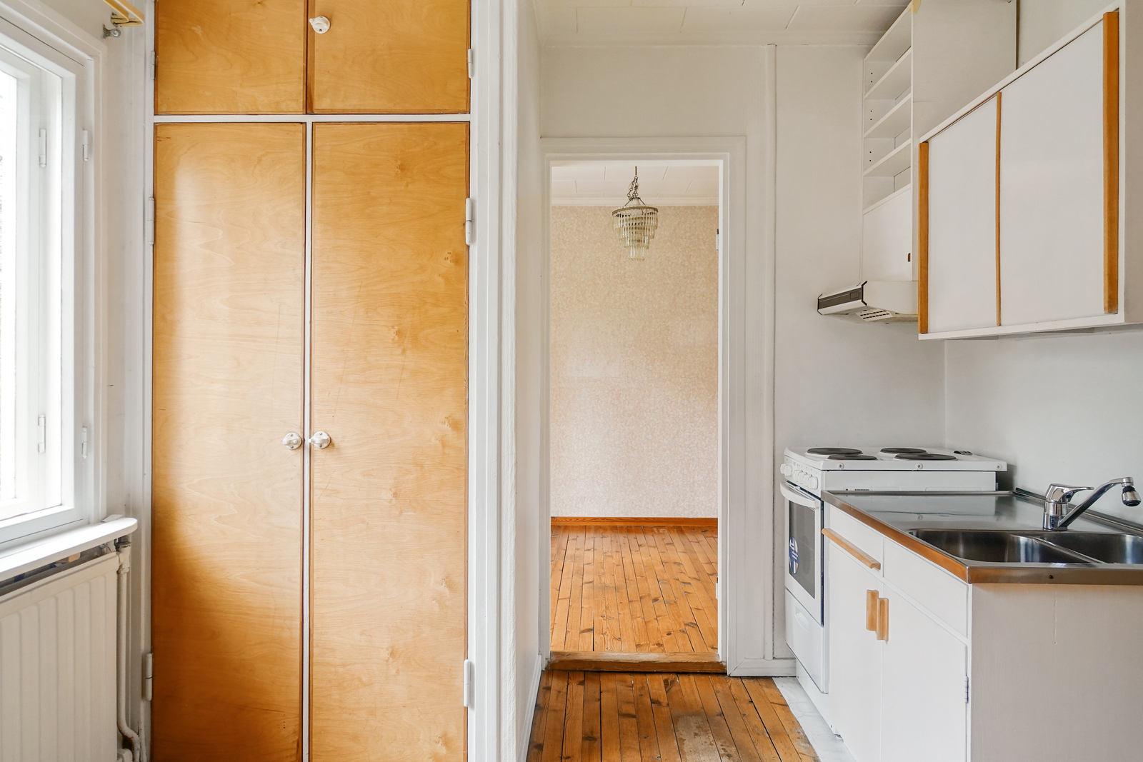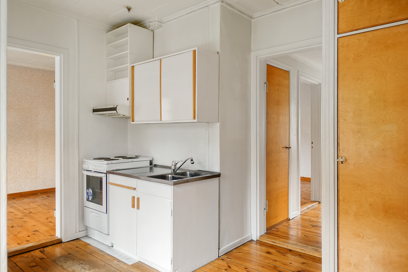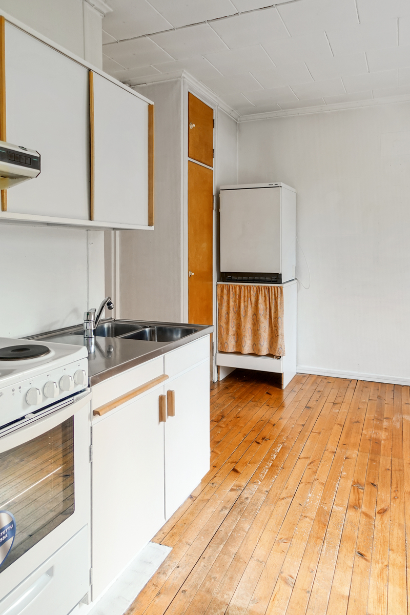 Keittiön kuvaus | Lautalattia, seinissä maalattu halltex-levy, sähköliesi, liesituuletin, jääkaappi, |