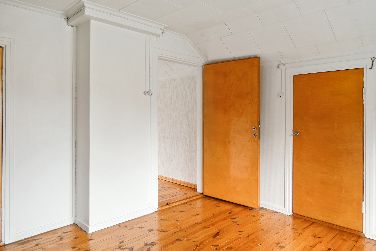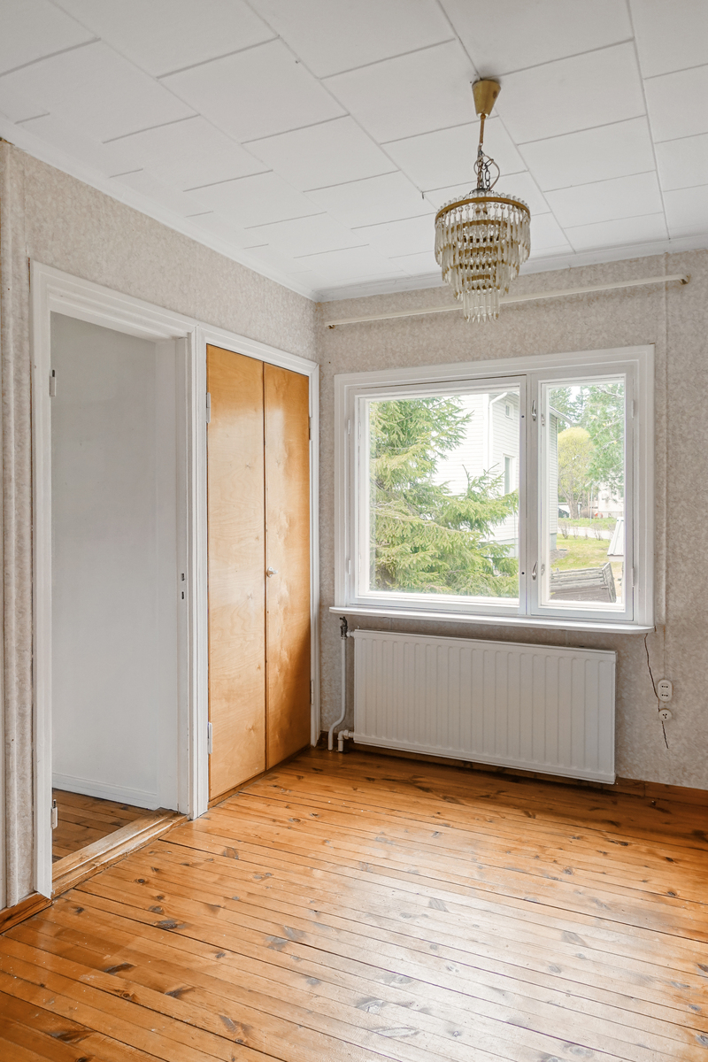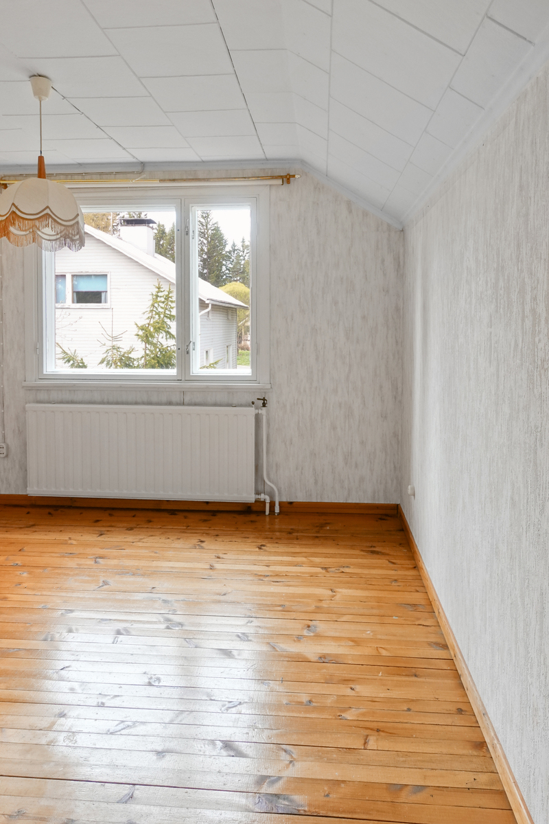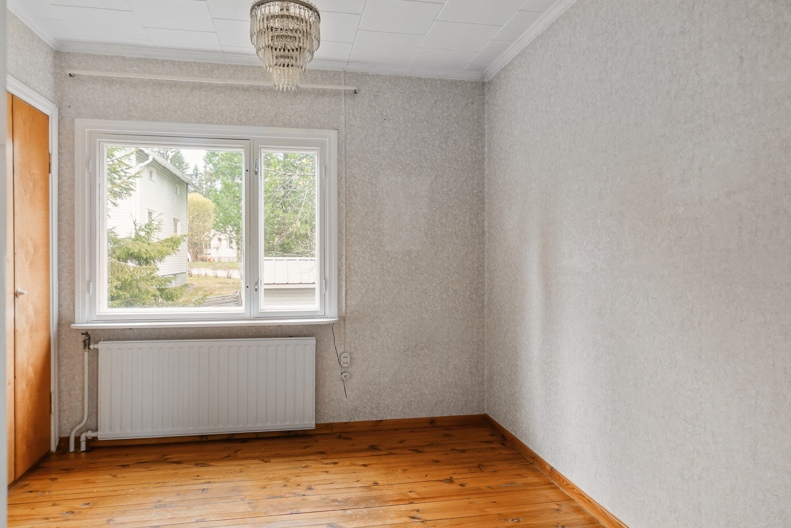 Makuuhuoneiden kuvaus | Lautalattia, seinät tapetoitu Yläkerran makuuhuone: lautalattia, seinät tapetoitu, levykatto |