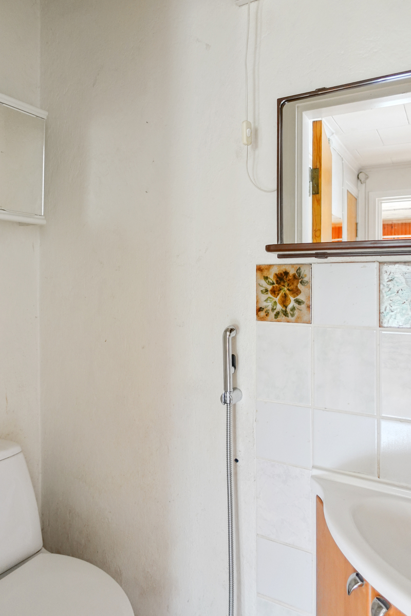 WC | Seinät maalattu/osittain laatoitettu, lattiassa muovimatto, katto haltex-levyä,wc-istuin, käsienpesuallas + allaskaappi, bideesuihku |