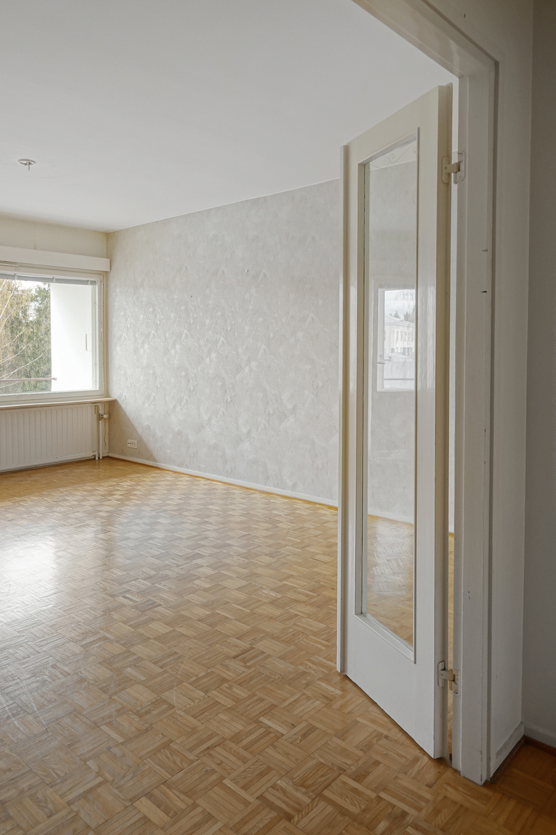 Olohuoneen kuvaus | Parkettilattia, tapetoidut seinät, maalattu katto |