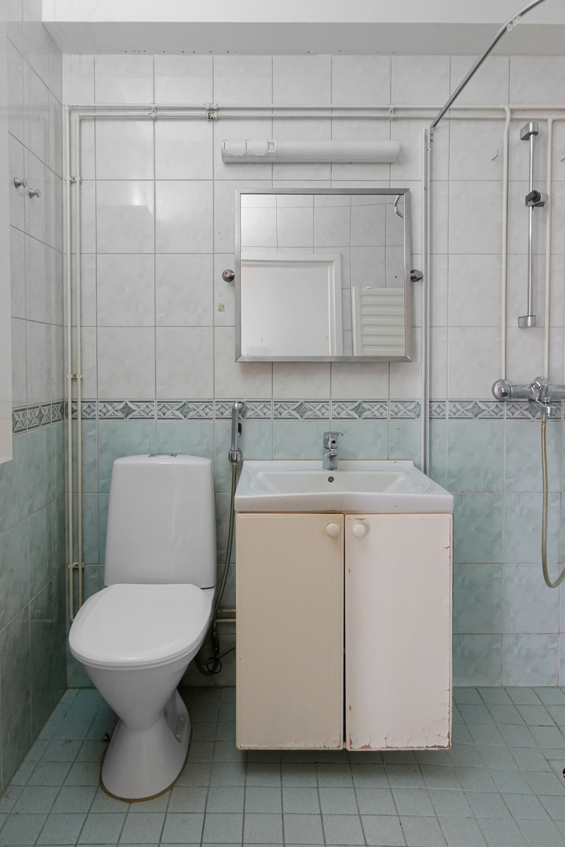 Kylpyhuoneen kuvaus | Laatoitettu lattia ja seinät, pyykinpesukoneliitäntä, allaskaappi, peilikaappi, lattialämmitys. |