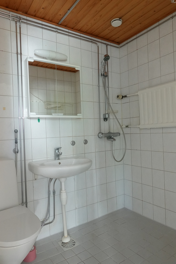 | Kylpyhuoneen kuvaus | Lattia ja seinät laatoitettu, suihku, pesukoneliitäntä, wc-istuin, pesuallas, peilikaappi. |