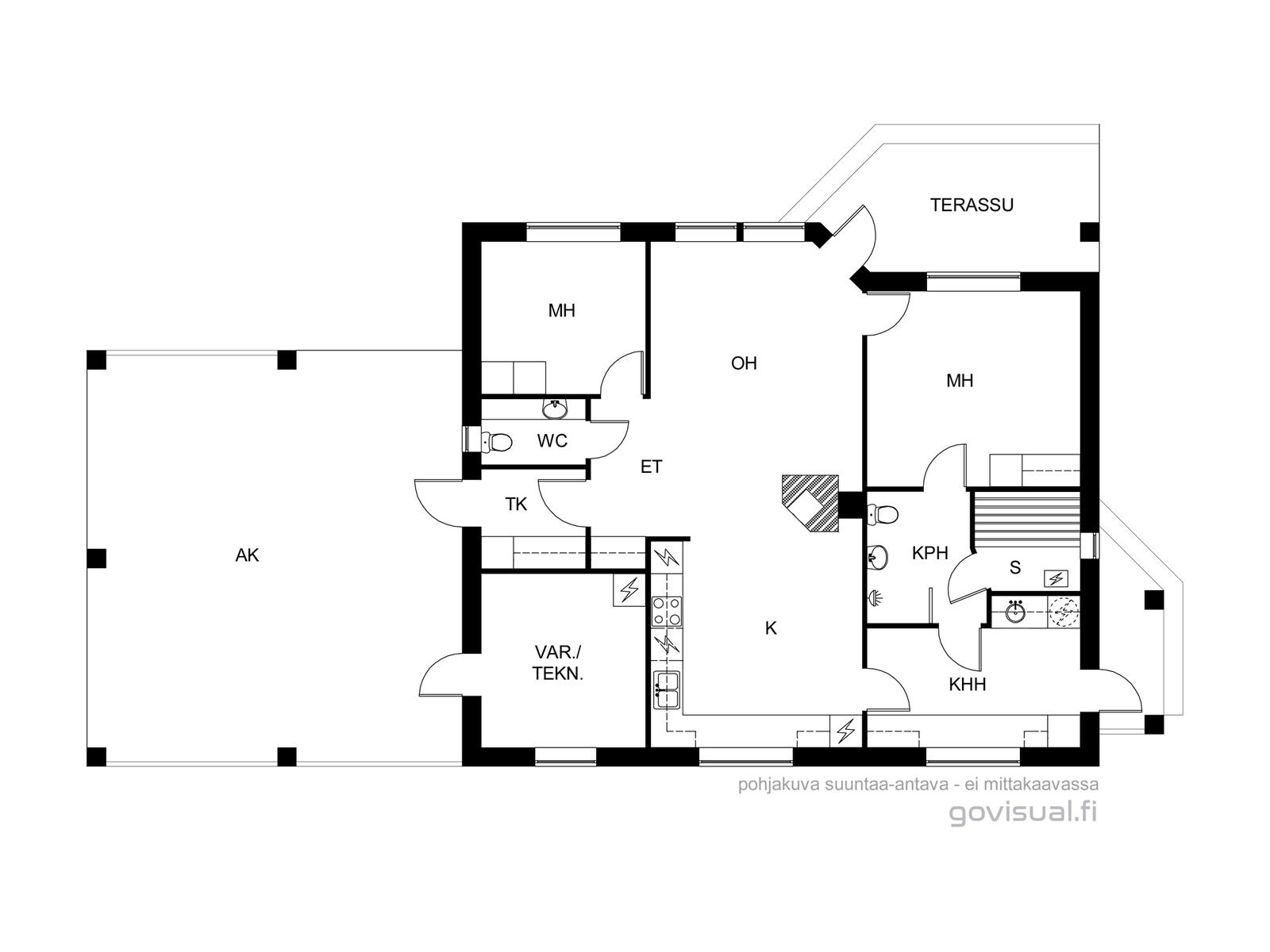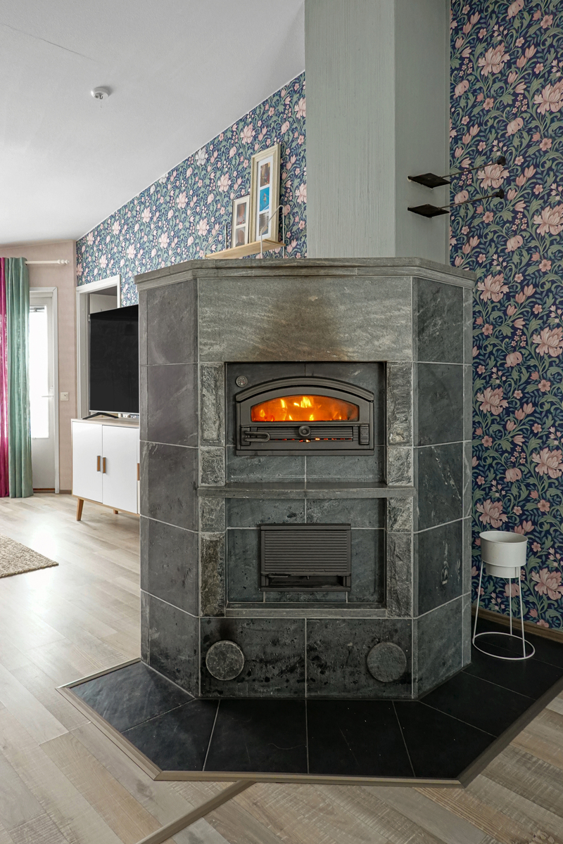 Tässä yksitasoisessa kodissa on toimiva pohjaratkaisu ja kauniita sisustusratkaisuja. Olohuone ja keittiö muodostavat yhden kokonaisuuden, jonka keskiössä on varaava leivinuuni. Avaruutta antaa korotettu katto ja laajat ikkunapinnat sekä olohuoneen että keittiön puolella. Keittiöön mahtuu hyvin tilava ruokailuryhmä ja olohuoneesta on käynti terassille. Kaksi makuuhuonetta on sijoiteltu siten että ne antavat yksityisyyttä asujilleen. Keittiöstä on käynti kodinhoitohuoneeseen sekä saunaosastolle. Lämmintä varastotilaa löytyy sisäänkäynnin vierestä.