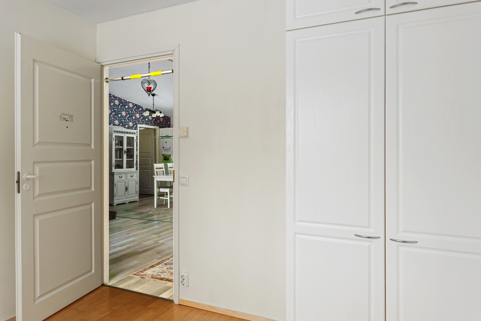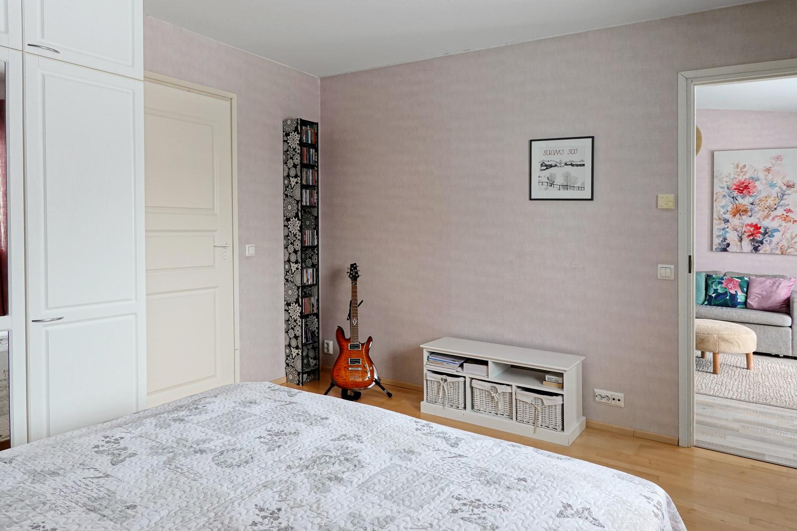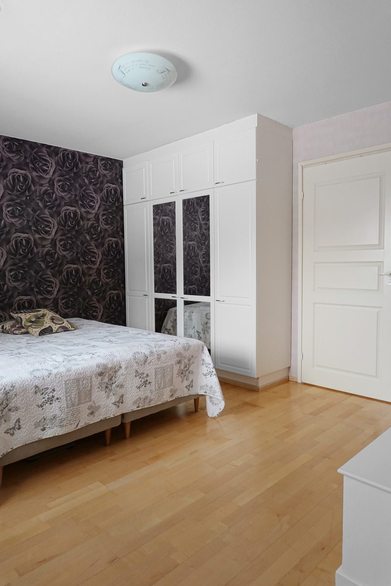 Makuuhuone: Parkettilattia, seinät tapetoitu, kaapit |