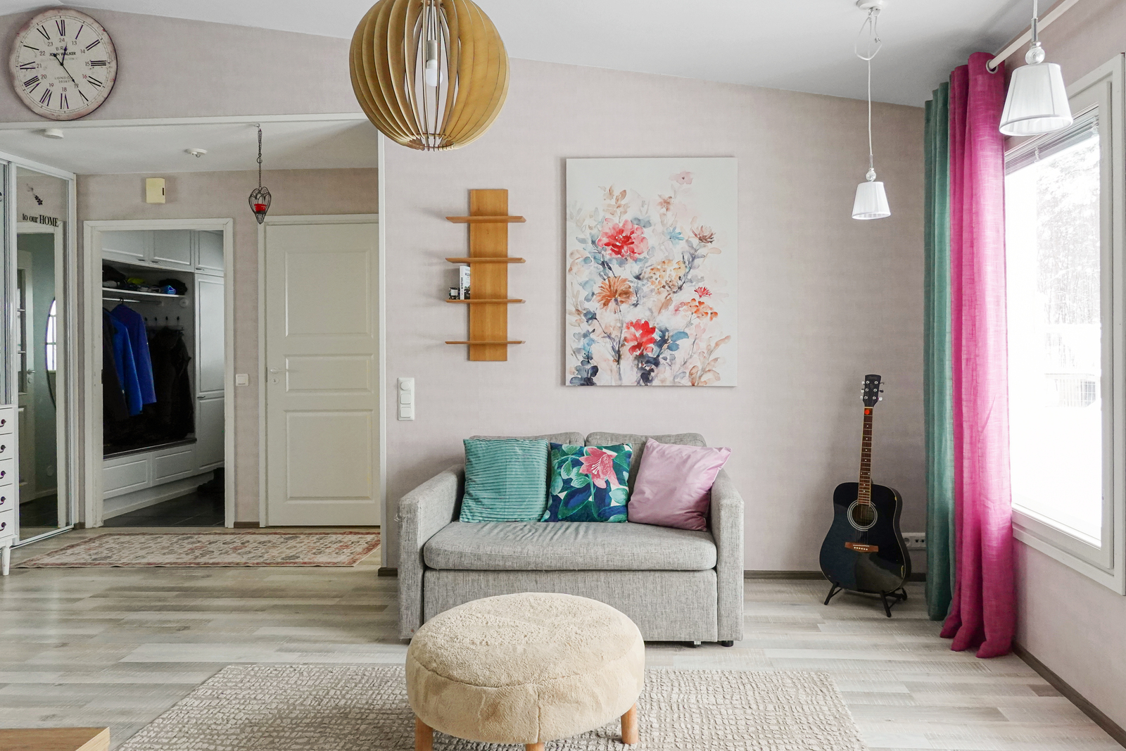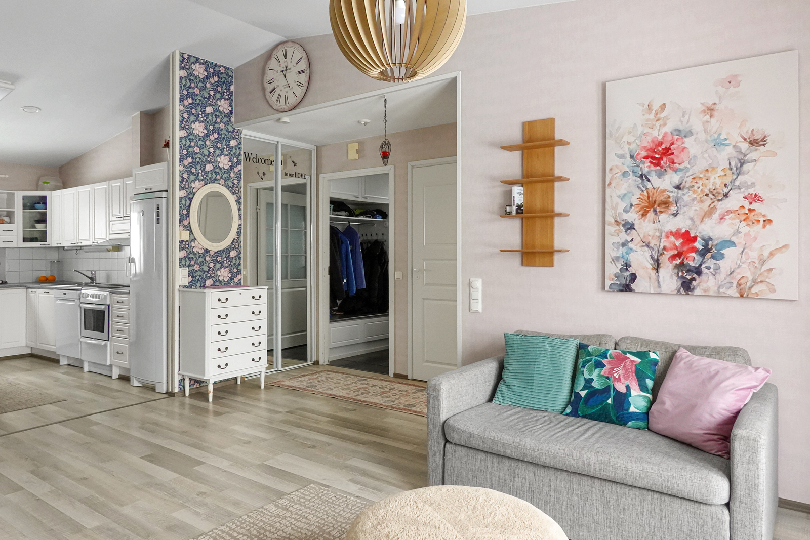 Tuulikaappi: Laattalattia, seinät maalattu, naulakko/kaapit, peillikaappi
