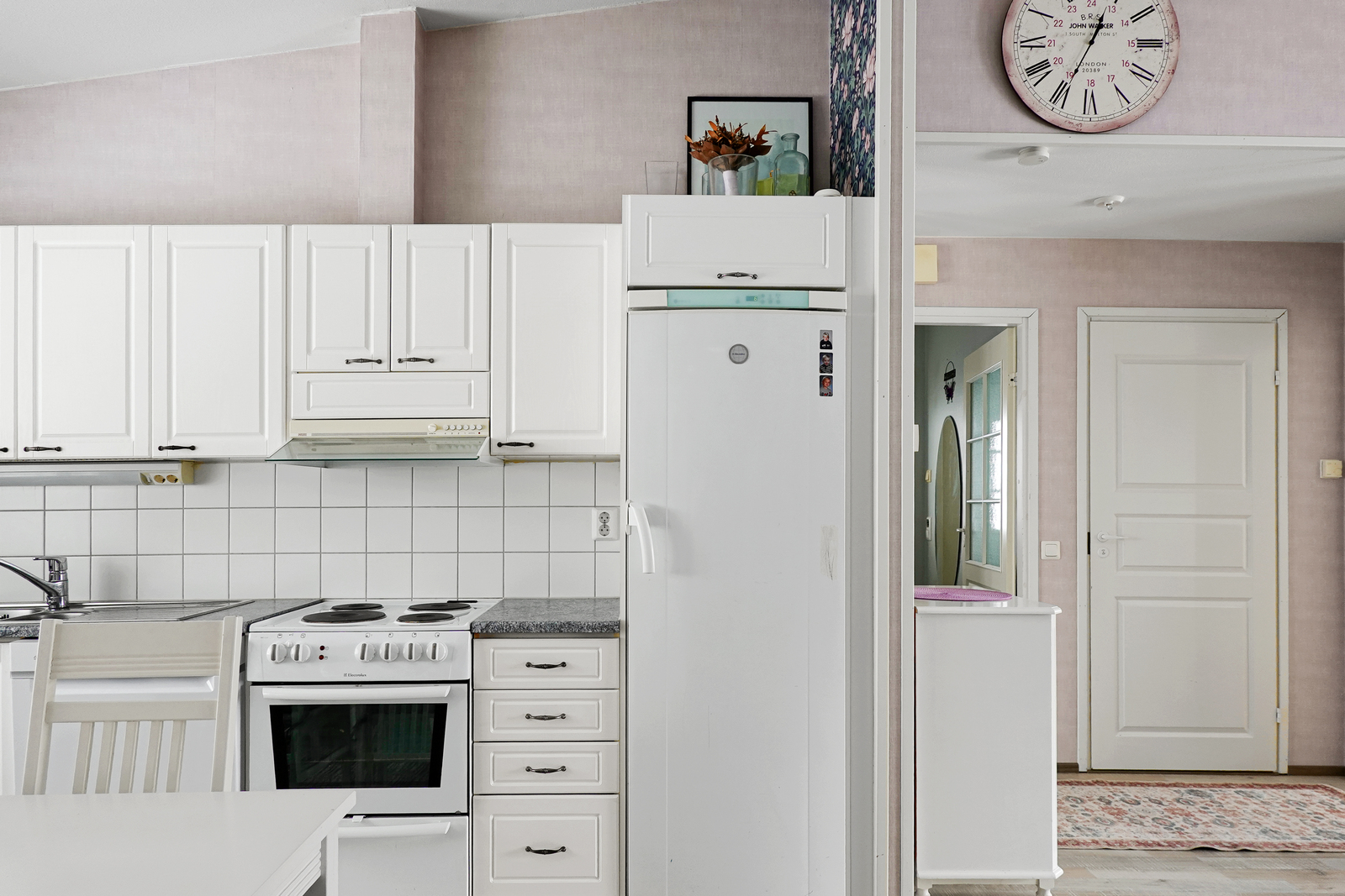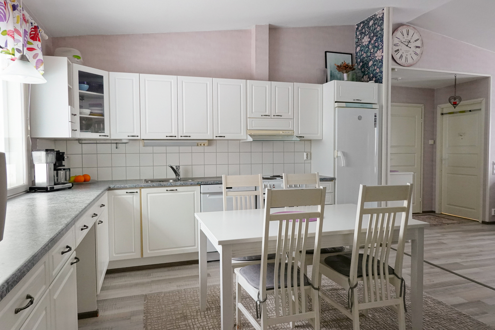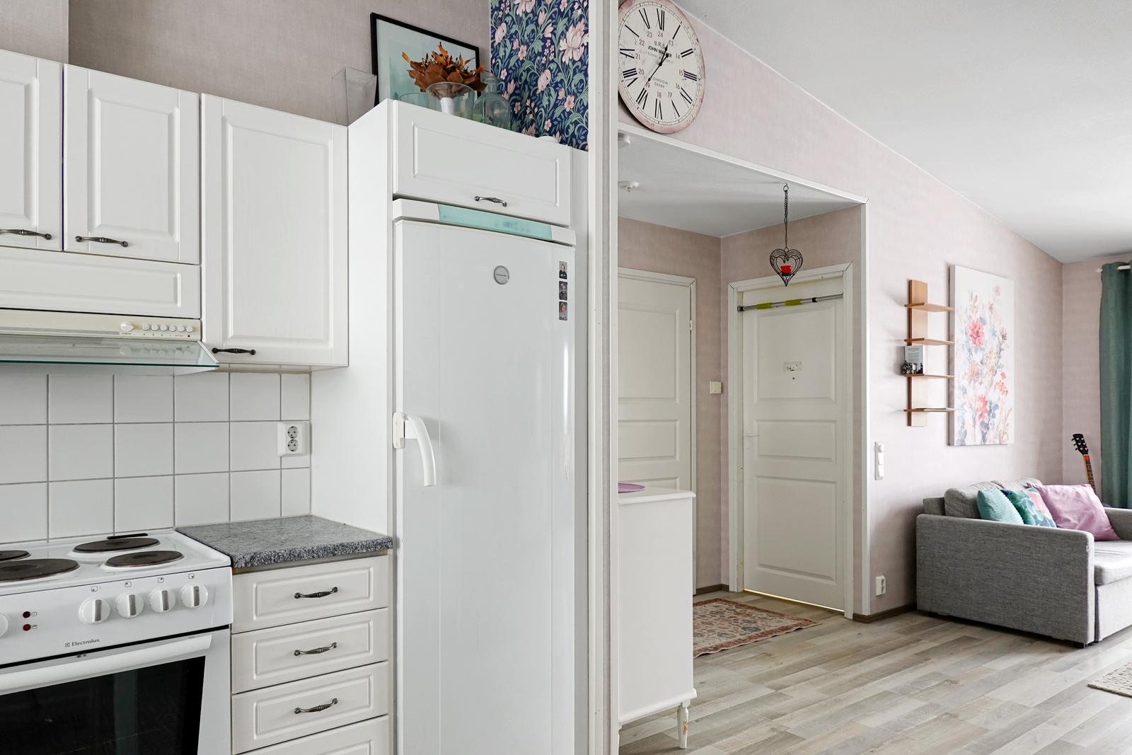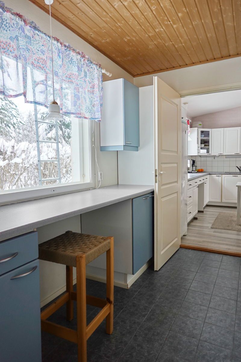 Laminaattilattia, seinät maalattu/tapetoitu, korotettu katto, sähköliesi, liesituuletin, jääkaappi, pakastin, astianpesukone (v. 2025), leivinuuni. |