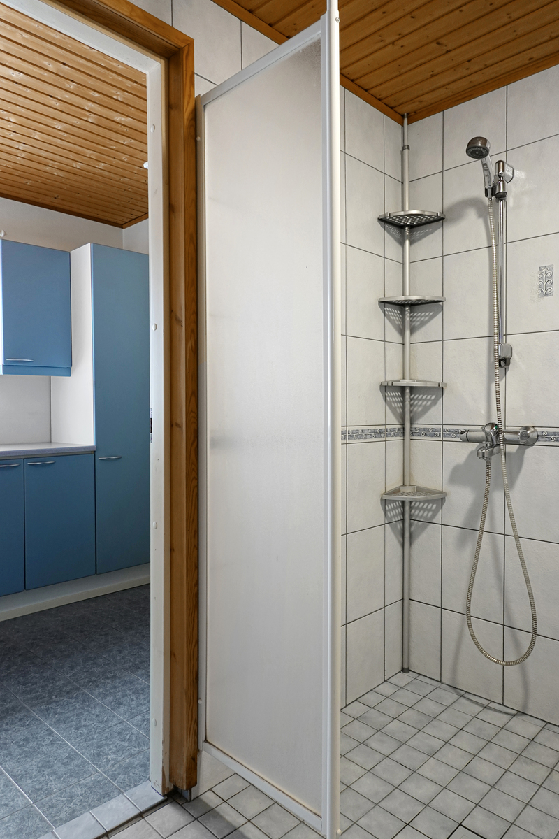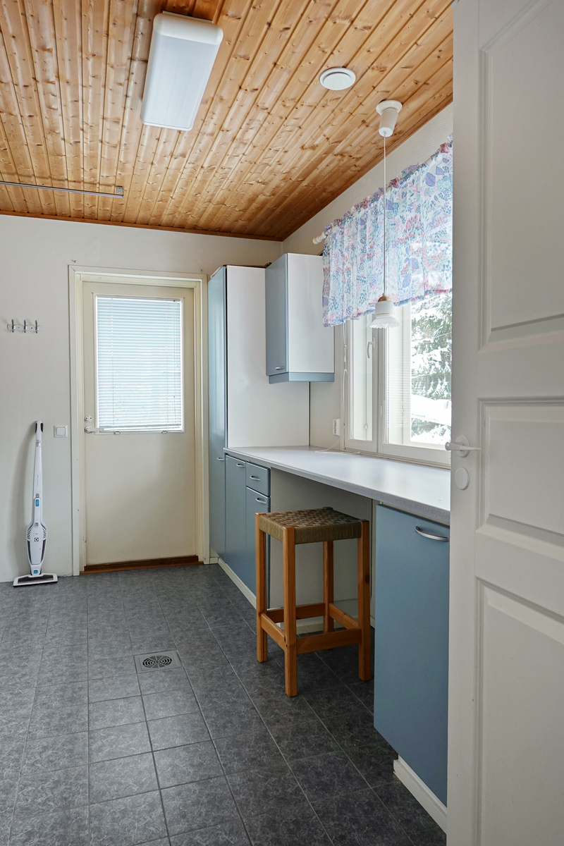 Laattalattia, seinät maalattu, paneelikatto, pesukoneliitäntä, lattialämmitys, kaapit |