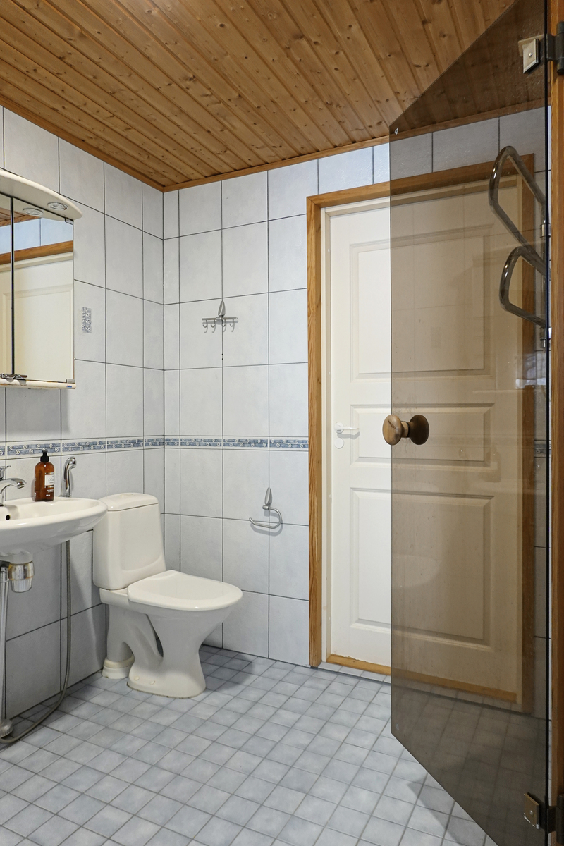 Lattia ja seinät laatoitettu, suihku, pesuallas, wc-istuin, peilikaappi. |