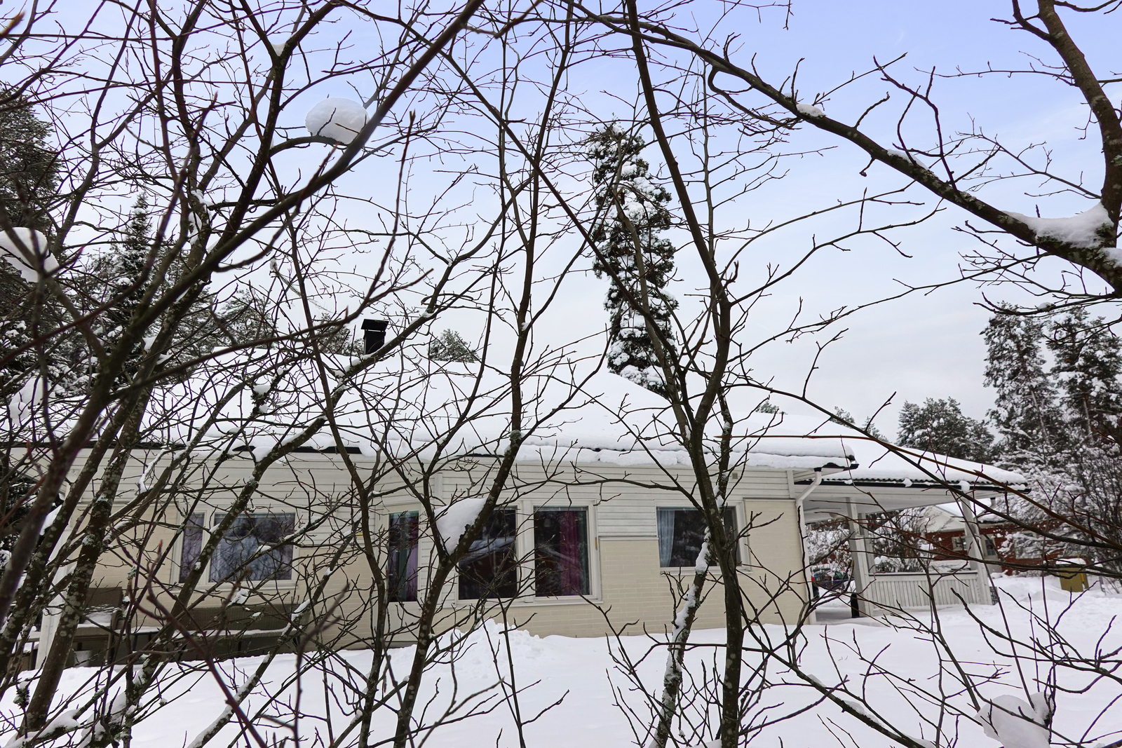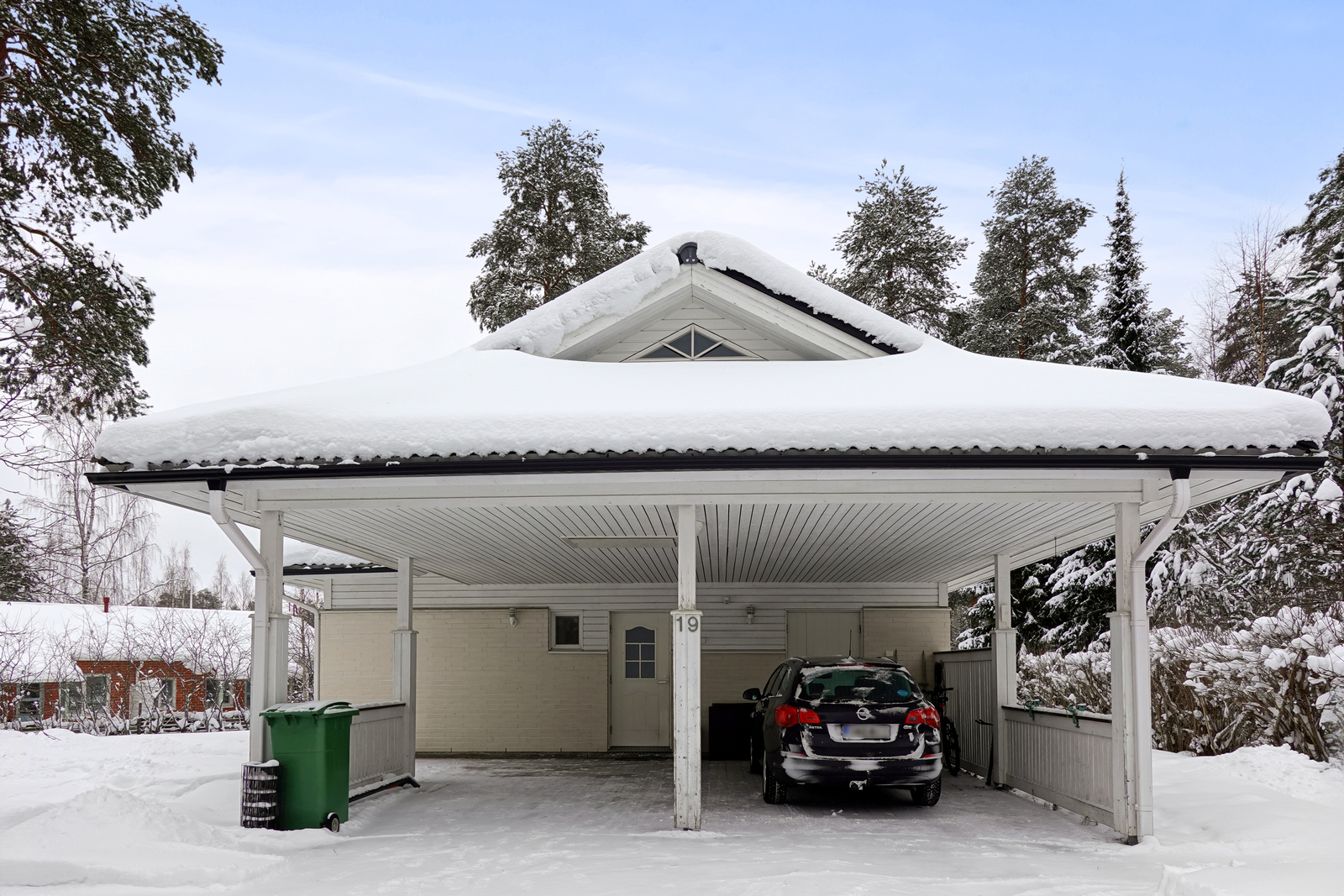 Rakennuksen yhteydessä on lämmin varastotila ja autokatos kahdelle autolle, autokatoksen kohdalla on käyttöullakko,