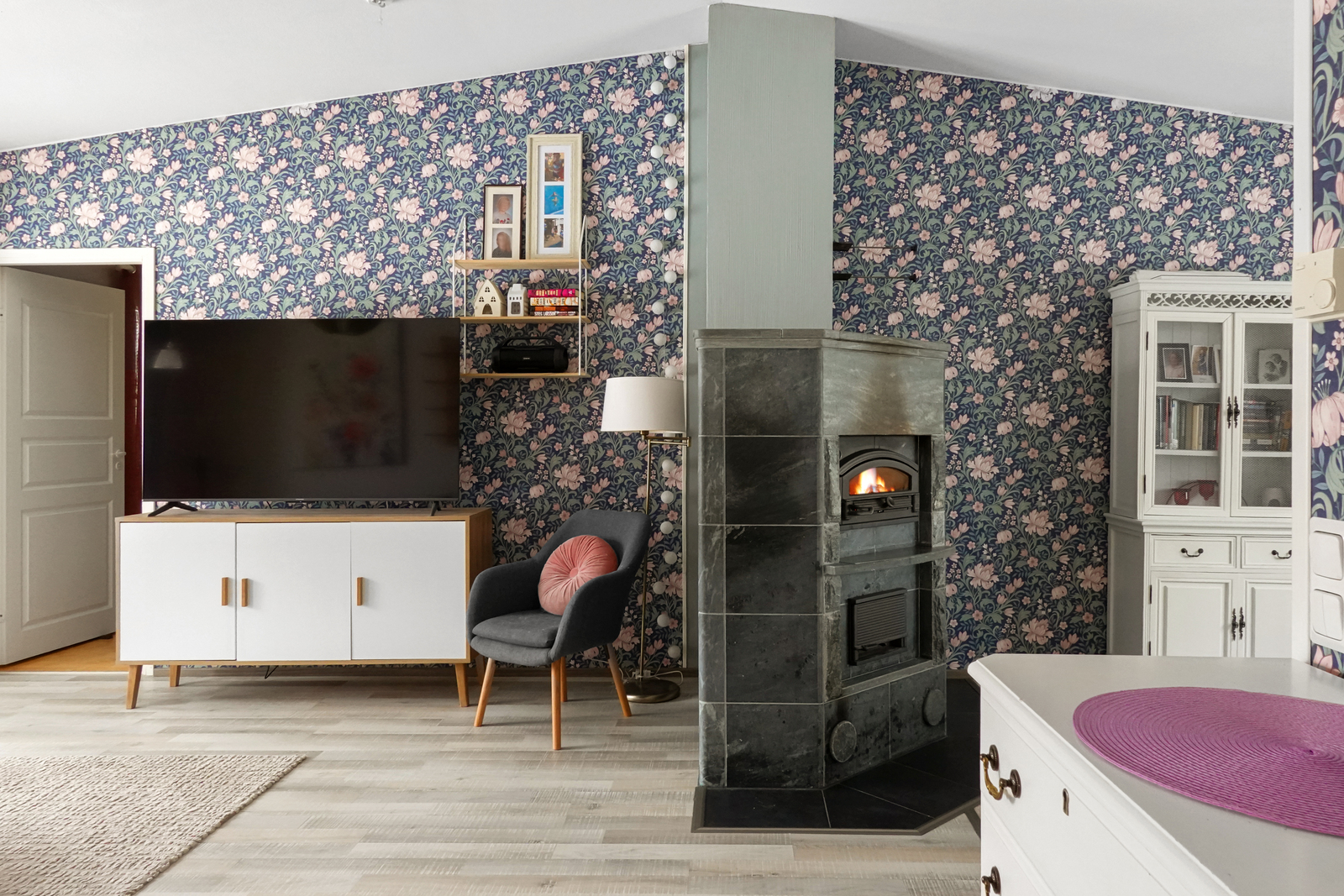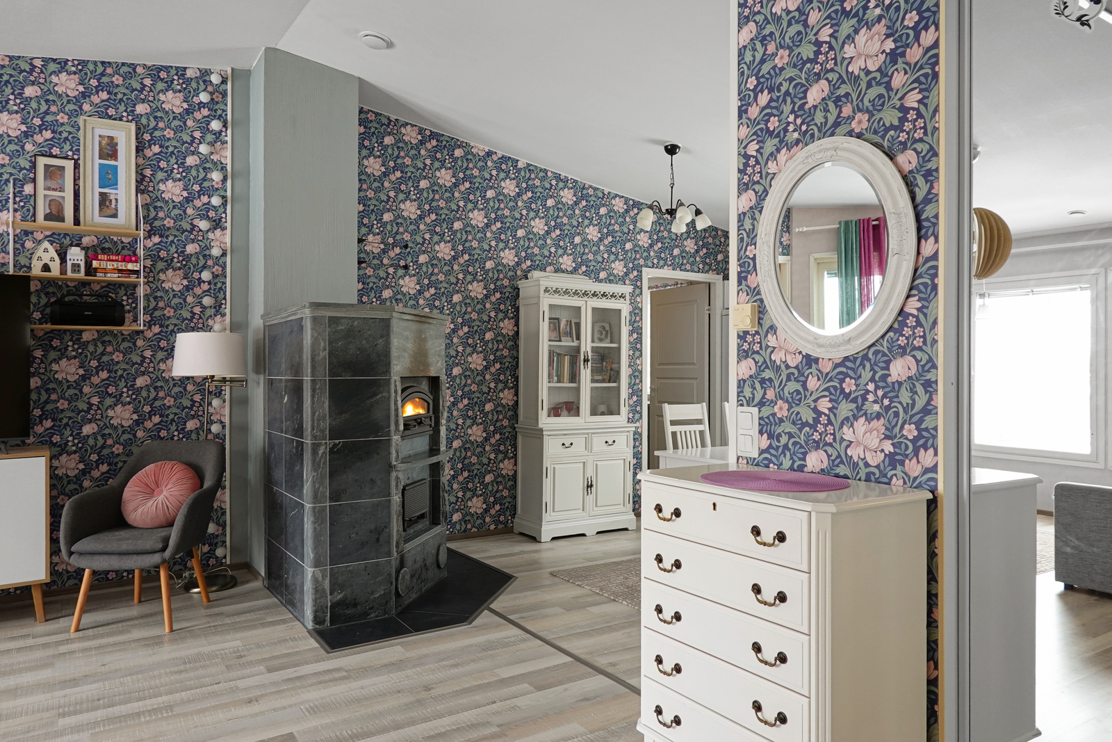 Laminaattilattia, seinät maalattu/tapetoitu, korotettu katto. |
