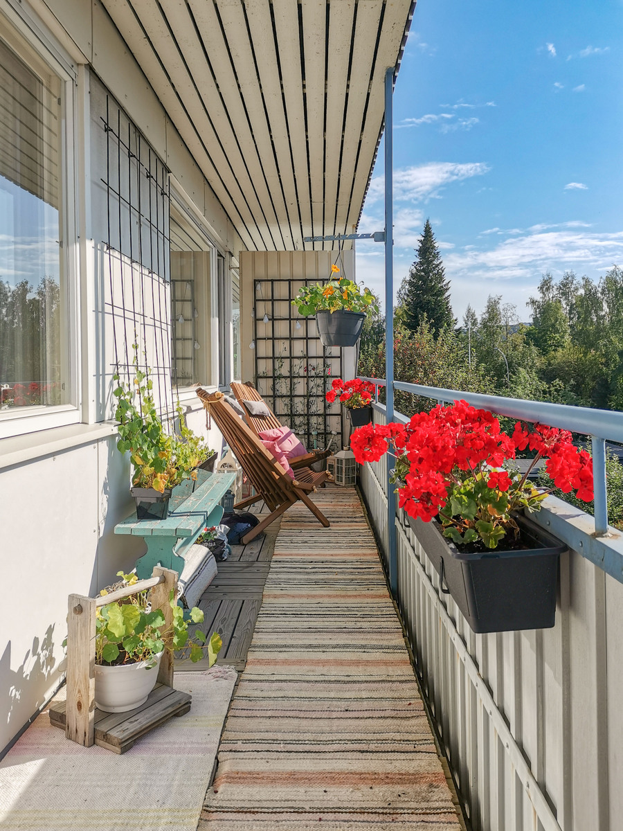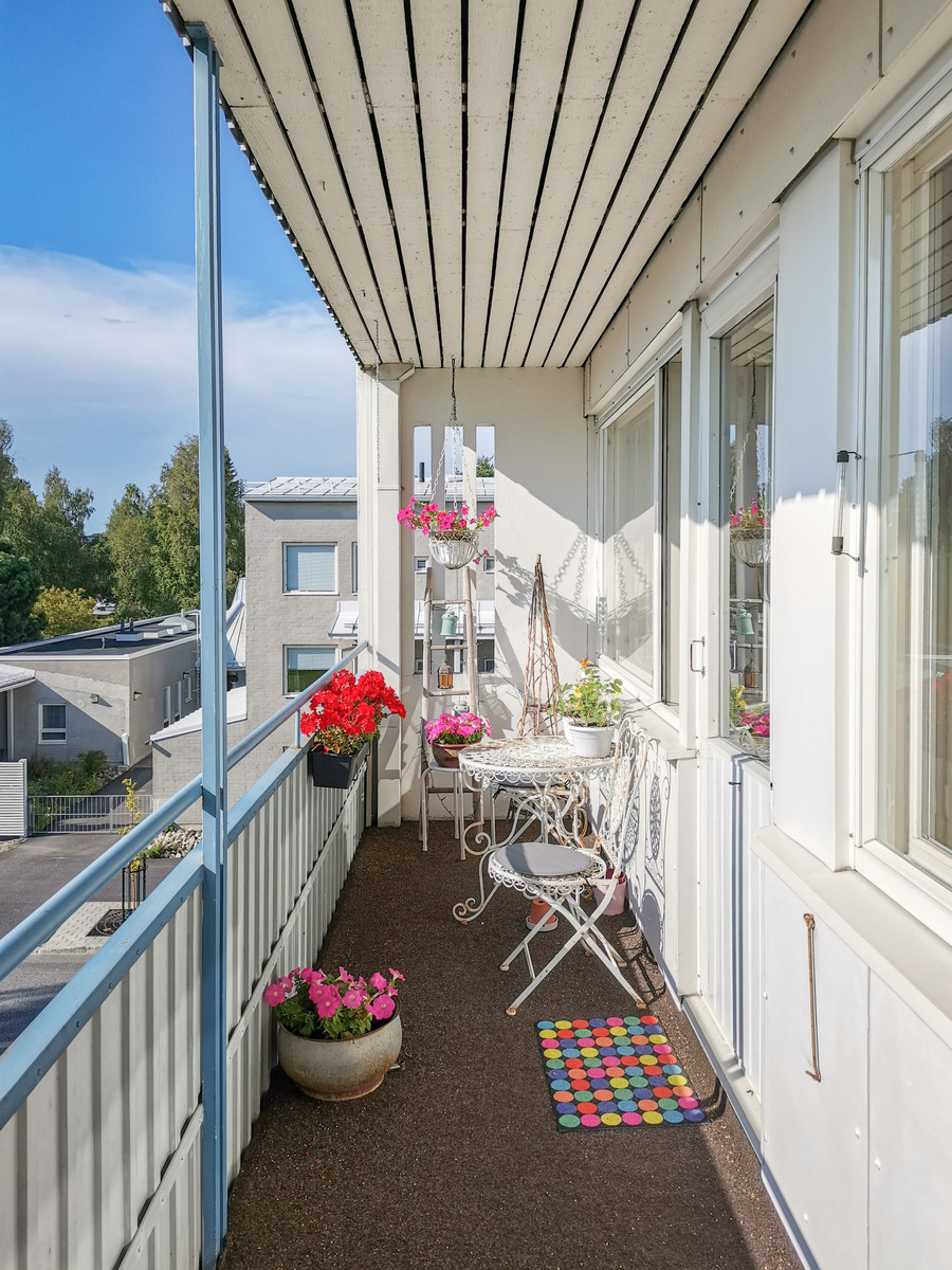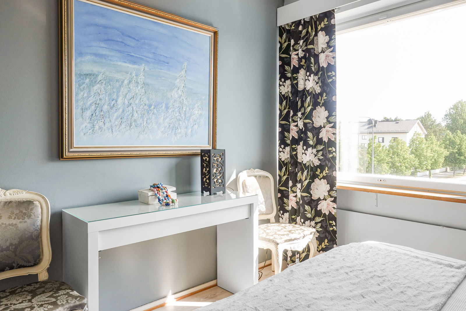 Tällaisia kerrostalohuoneistoja on harvoin tarjolla. Kolme makuuhuonetta, työhuone sekä avoin keittiö- ja olohuonetila sopivat isommallekin perheelle. Olohuoneesta käynti koko huoneiston levyiselle parvekkeelle, joka suorastaan kutsuu viettämään lämpimiä kesäpäiviä.