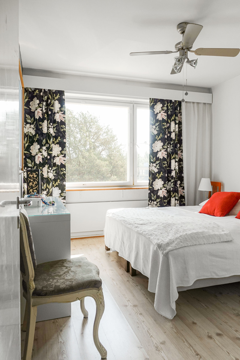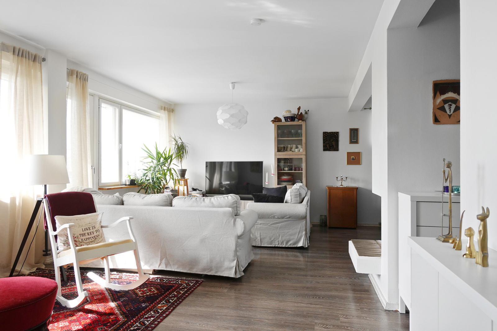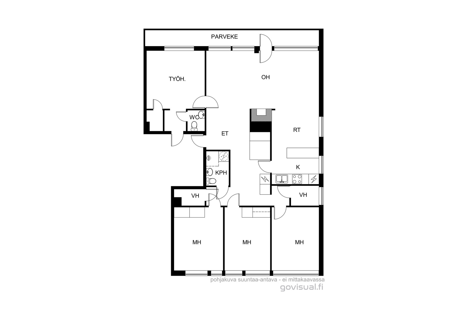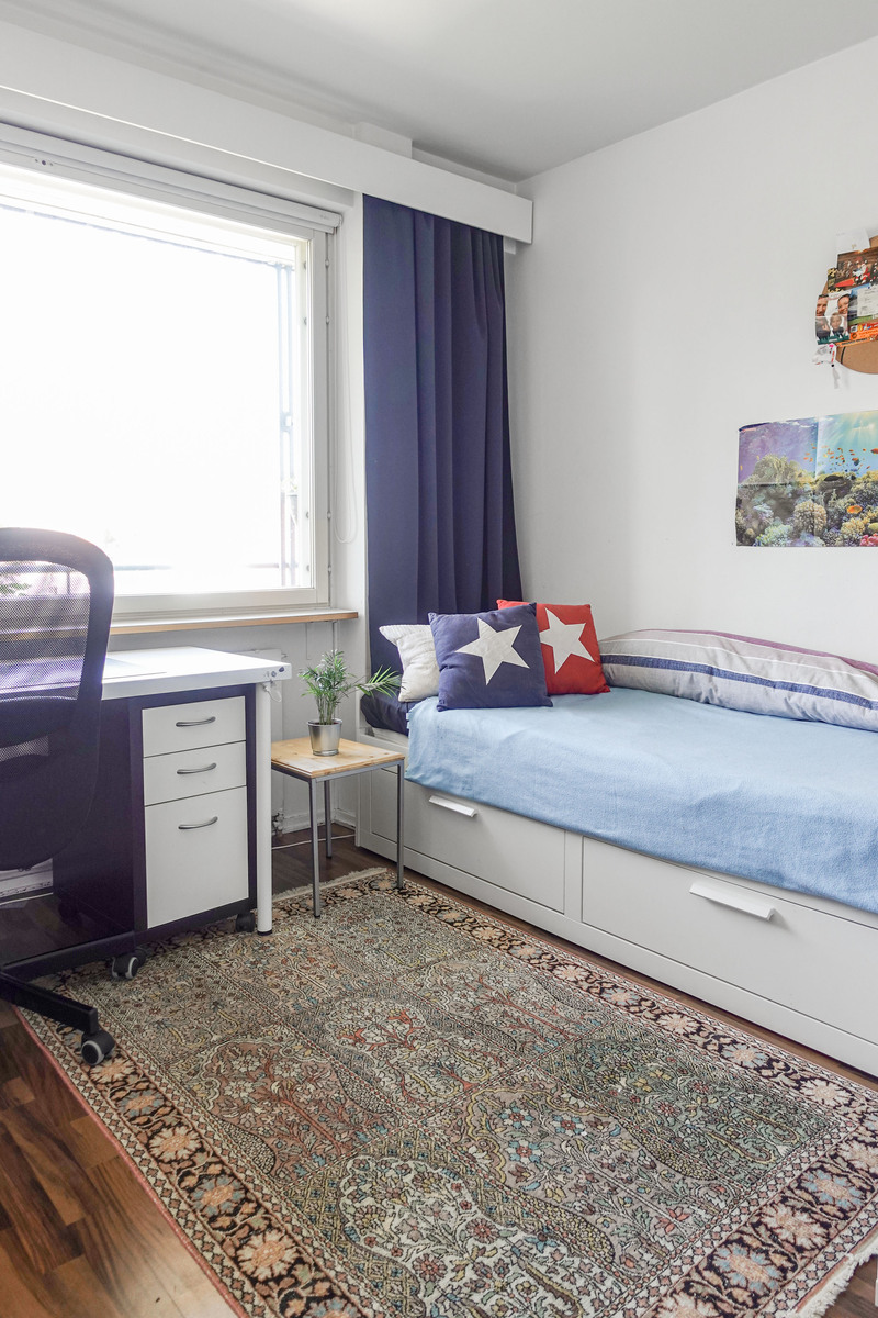 Tällaisia kerrostalohuoneistoja on harvoin tarjolla. Kolme makuuhuonetta, työhuone sekä avoin keittiö- ja olohuonetila sopivat isommallekin perheelle. Olohuoneesta käynti koko huoneiston levyiselle parvekkeelle, joka suorastaan kutsuu viettämään lämpimiä kesäpäiviä.