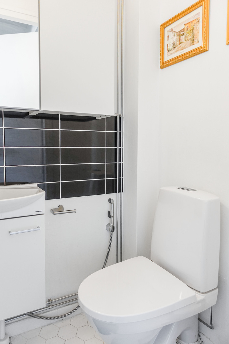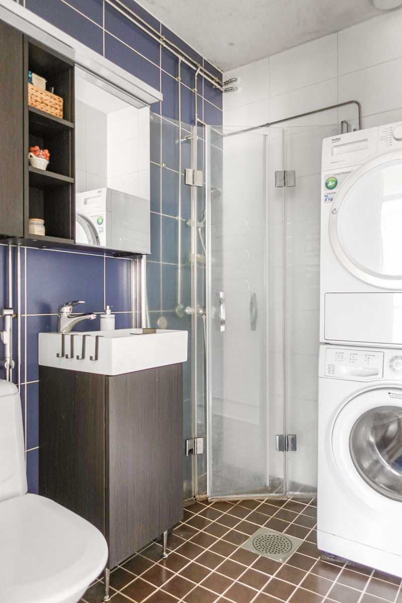 Suihkuseinä, pesukoneliitäntä, wc-istuin, suihku, peilikaappi, kylpyhuonekaapisto, asennettuja erikoisvarusteita |